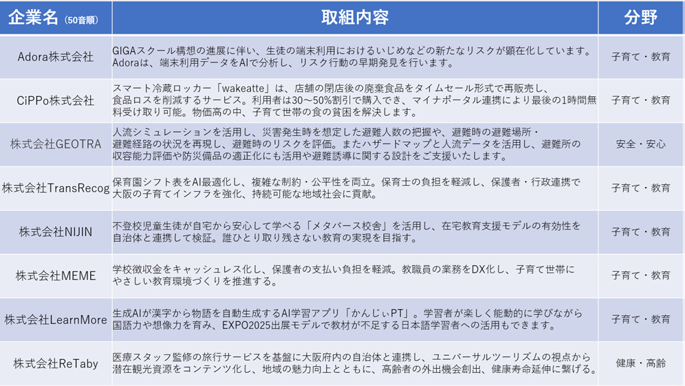登壇企業につきましては、参画企業の募集を行い、事前審査の結果、以下のとおり登壇企業が決定しました。